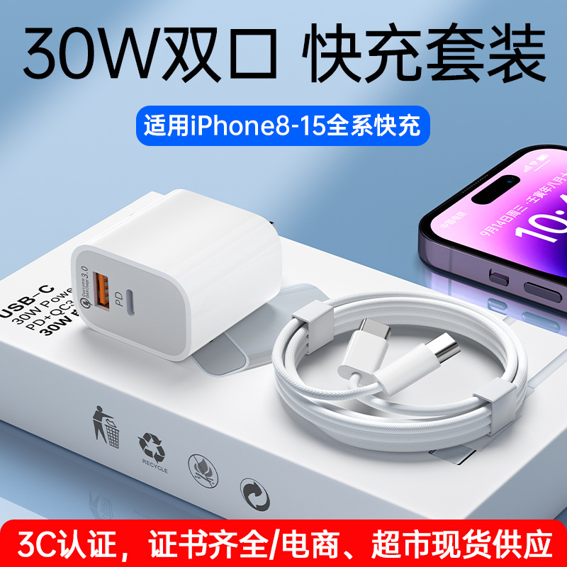 Berlaku untuk Apple PD pengisi daya 30WA + C Kepala pengisi daya ponsel dua port kabel data pengisi daya Cepat setelan grosir