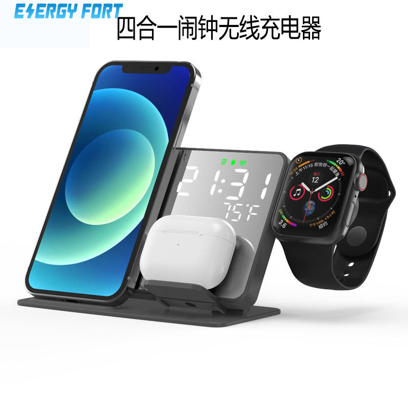 Jam alarm Tampilan digital LED, headset ponsel nirkabel Empat dalam satu 15W dengan braket pengisian daya, tampilan digital LED