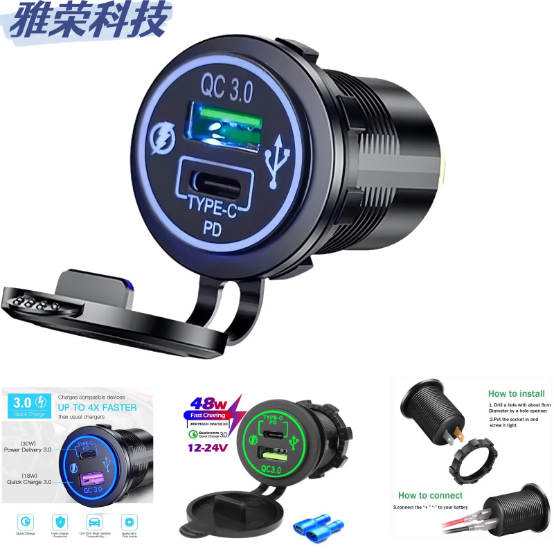 防水车载充电器改装快充TYPE-C接口智能手机QC3.0+PD3.0转换插头