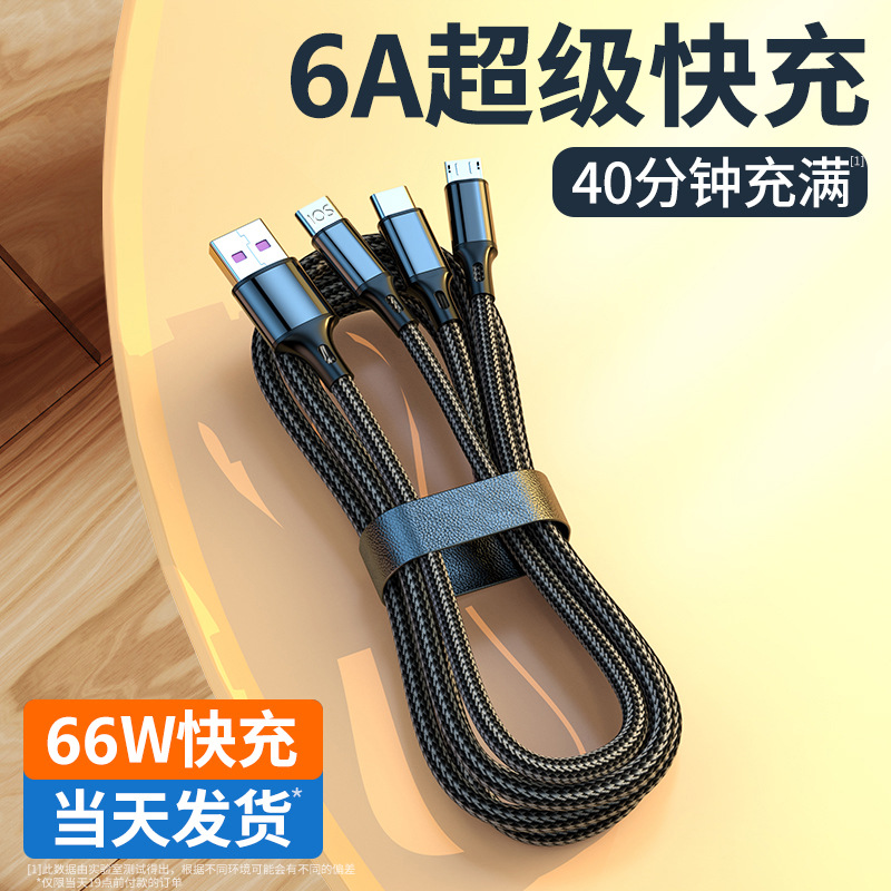 Kabel data pengisian daya super cepat 66W, satu seret tiga berlaku Android Apple Huawei 6A model penuh kabel pengisian daya tiga dalam satu