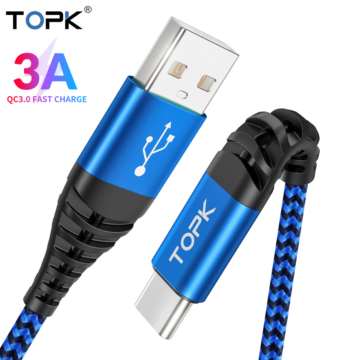 TOPK kabel data pengisi daya cepat, anyaman nilon dua warna 3A kabel pengisian daya ponsel cocok untuk Android Apple tc