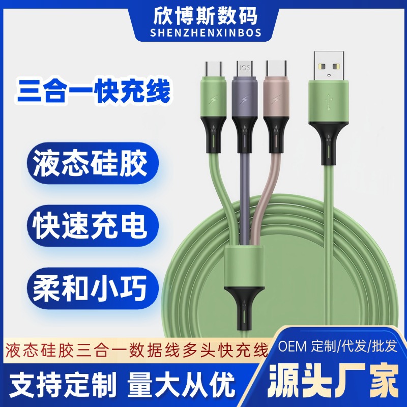 Silikon Cair Satu Tarik Tiga Kabel Data Tiga Kepala Ponsel Universal Banyak Pengisian Cepat Tiga Kabel Pengisian Listrik Pabrik Grosir