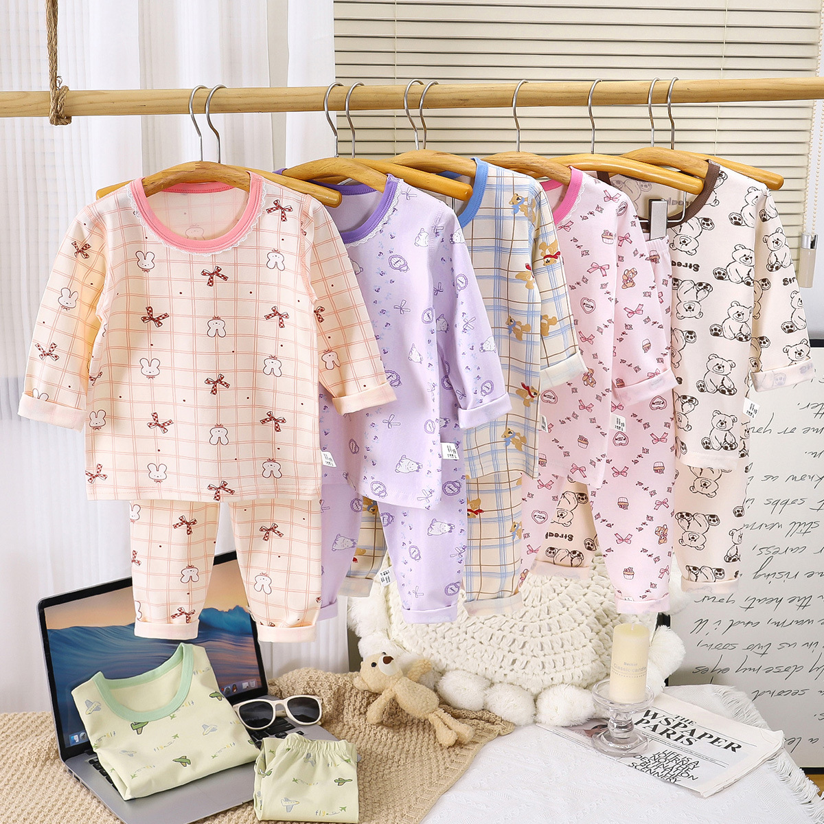 Setelan piyama katun murni anak-anak, setelan piyama katun murni AC untuk anak laki-laki dan perempuan kelas A lengan panjang musim semi dan musim panas, pakaian rumah tipis