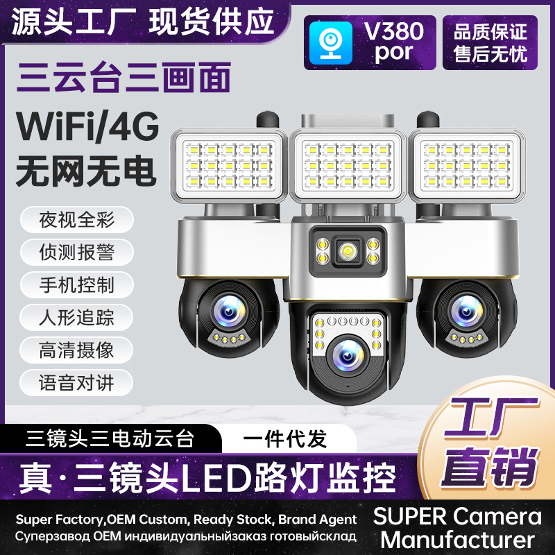 Lintas Batas Baru V380 Tiga Lensa Lampu Jalan LED 200W Penuh Warna Malam Visi 4G Kamera Wifi Pemantauan Tanpa Sudut Mati