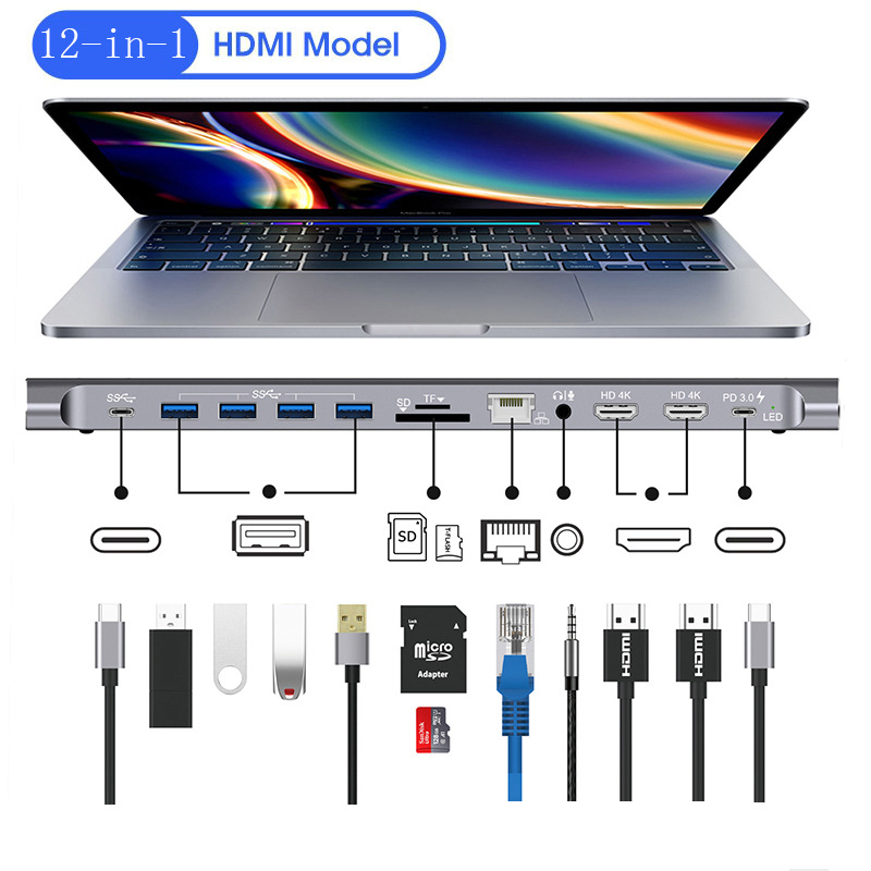 TYPE-C Dok ekspansi 12-in-1 ke USB 3.0HUB port jaringan gigabit dual HDMI4k ekspansi pd3.0 pengisian daya Cepat
