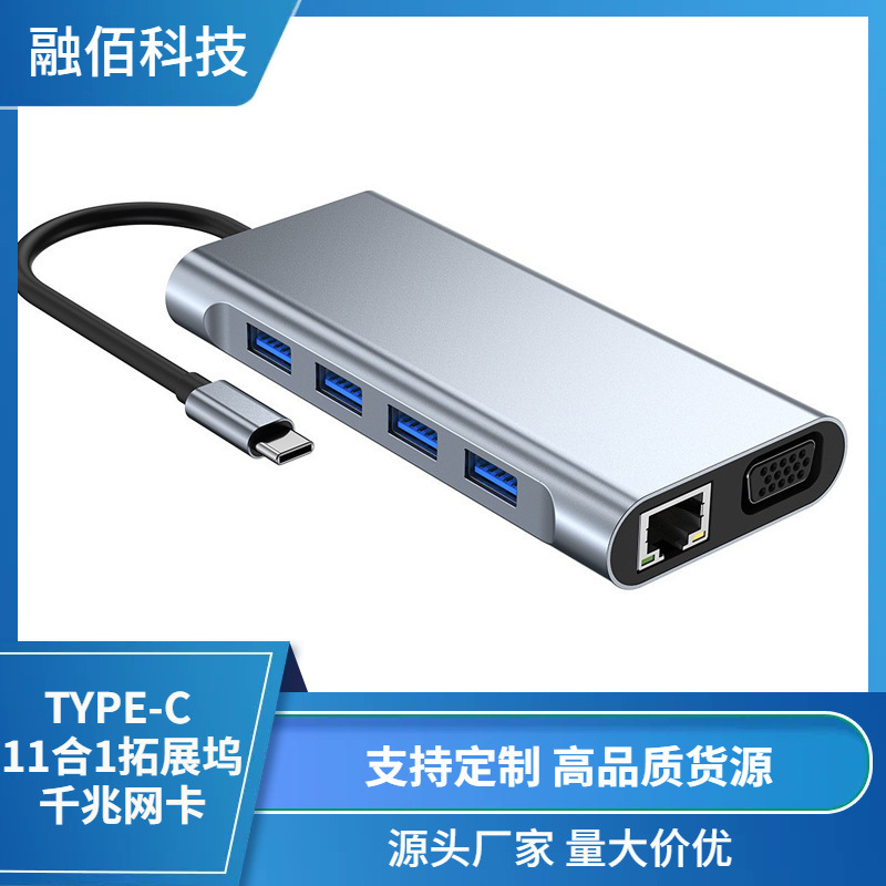 Hub baca kabel Eight-in-one, stasiun Dok tipe-c ke HDMI + VAG Gigabit RJ45 + USB3.0HUB