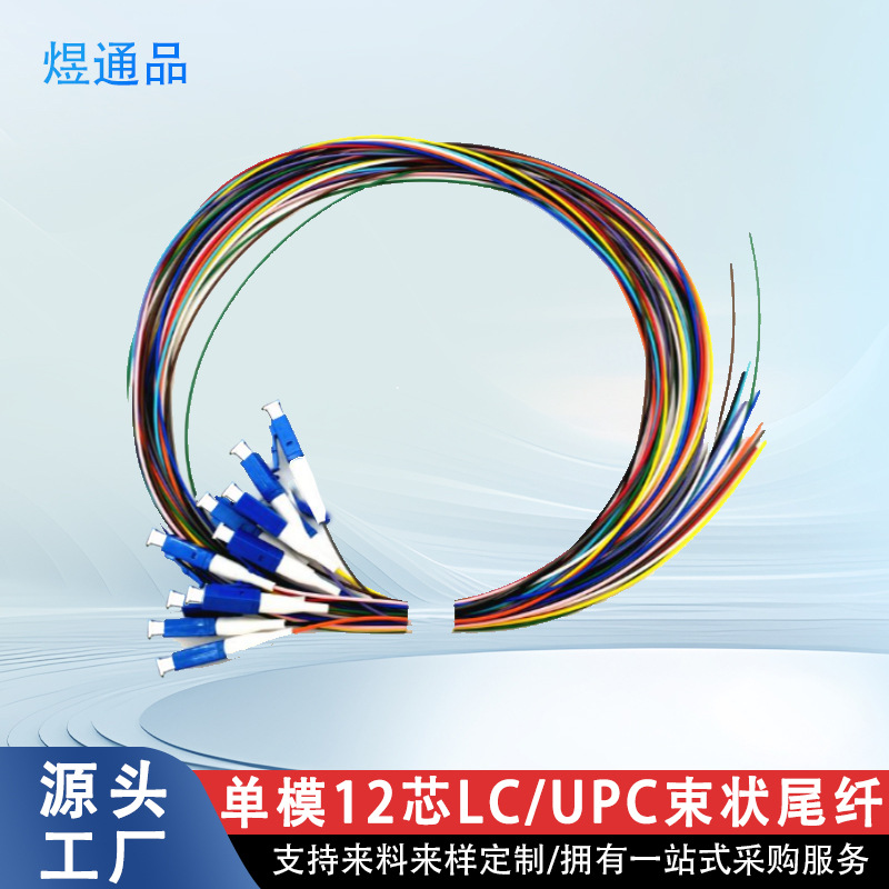 Kabel patch fiber optik pigtail single-mode 12-core LC ribbon berkualitas telekomunikasi dengan kepala persegi kecil.