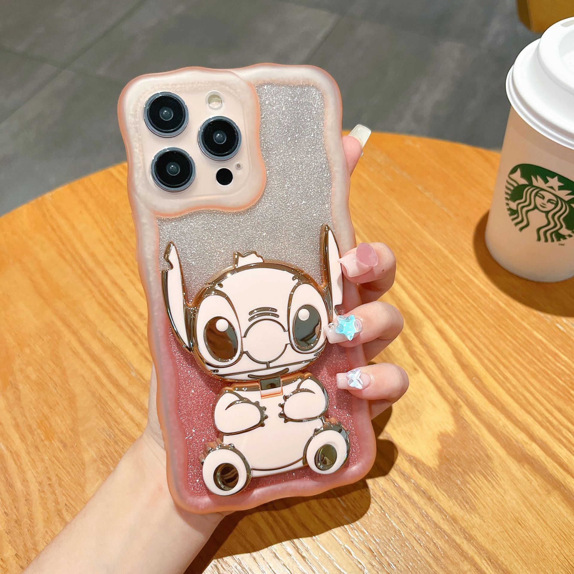 Casing ponsel boneka kartun anak perempuan, braket pelindung ponsel cermin rias, fungsi ganda vertikal dan horizontal, braket portabel modis