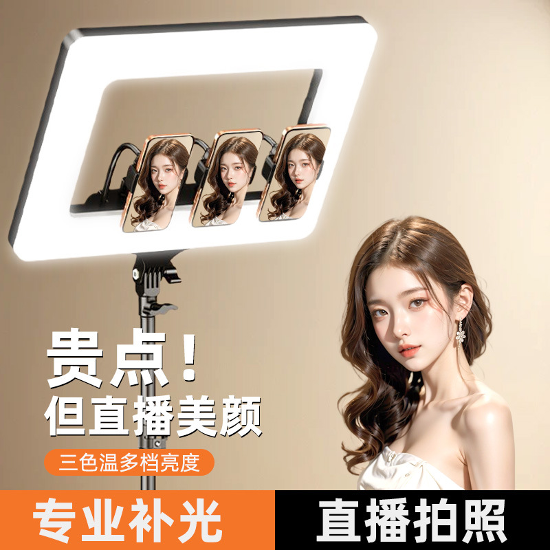 Lampu Kandang Kelinci Fotografi Langsung Ponsel Lampu Tambahan Cincin Persegi Tiga Warna 18 Inci Portabel Khusus untuk Makeup Foto Meja Genggam