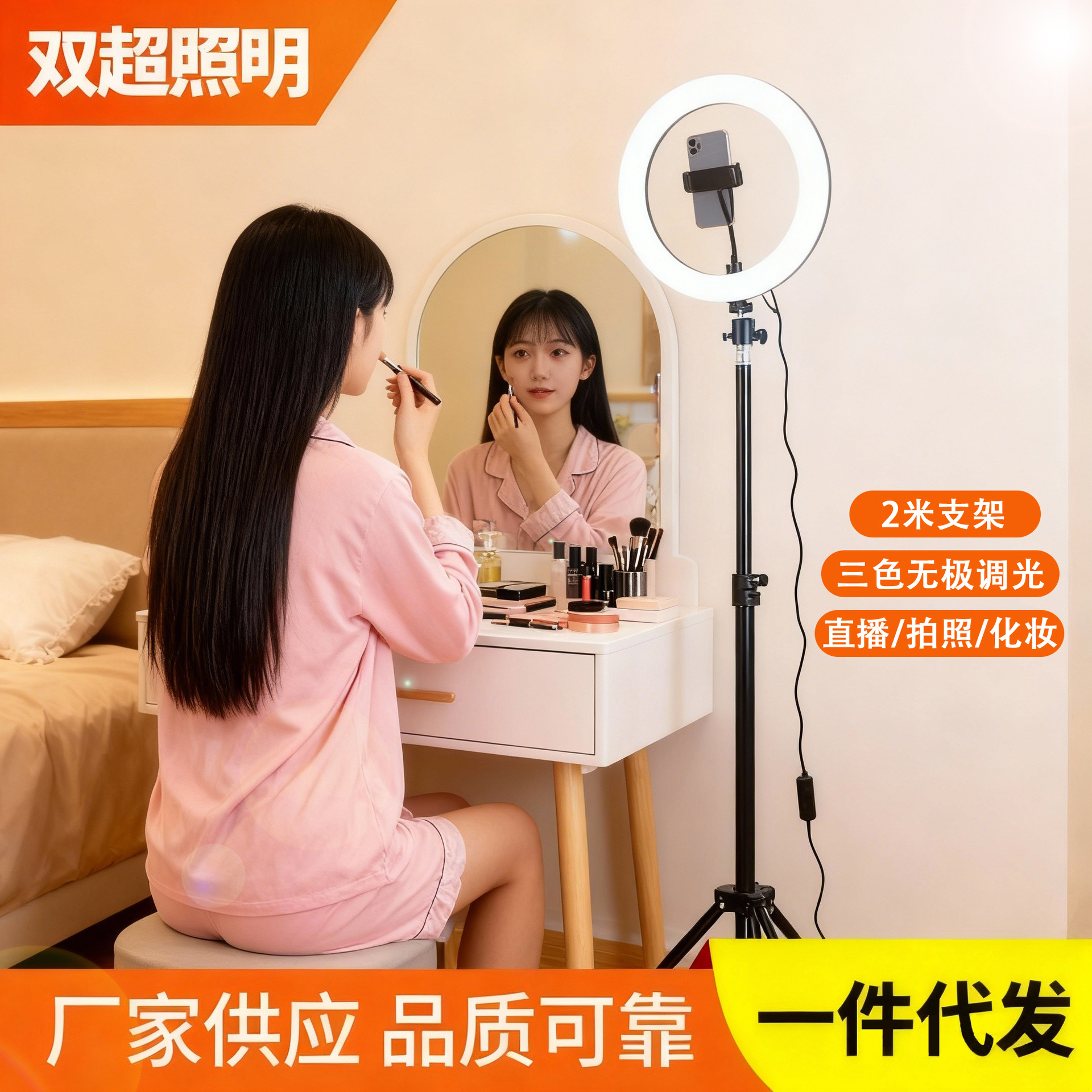 Lampu tembak lantai selebriti Online, cahaya pengisi kecantikan selfie tiga warna 10 inci cincin LED