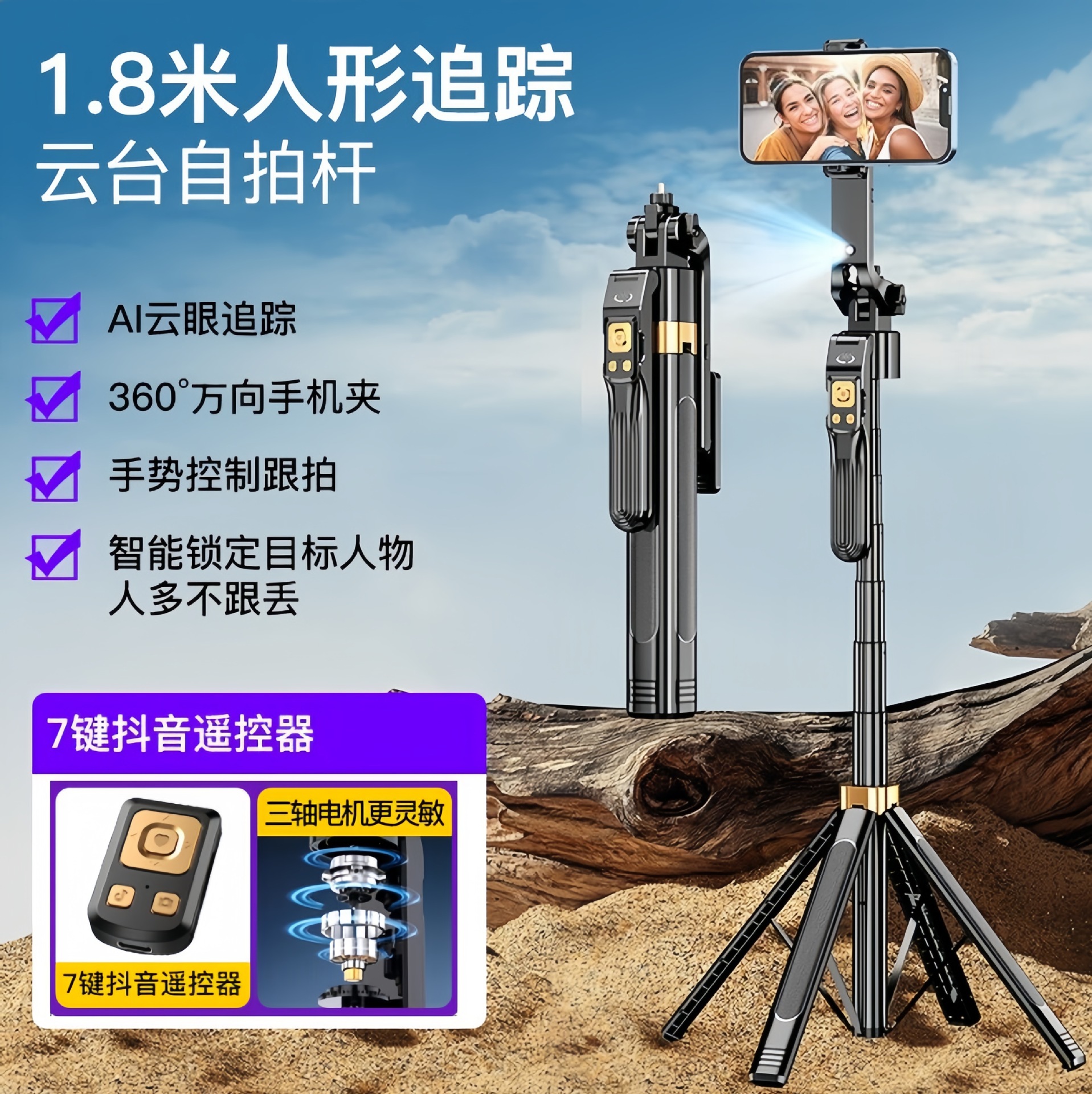 Tongkat selfie ponsel, pengenalan wajah pintar empat tripod penyimpanan terintegrasi berputar 1.8 m 360 °
