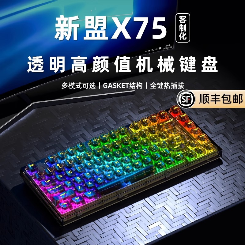 Xinmeng X75 keyboard mekanik transparan penuh Bluetooth nirkabel tiga mode kabel RGB poros plug-in panas khusus Gasket