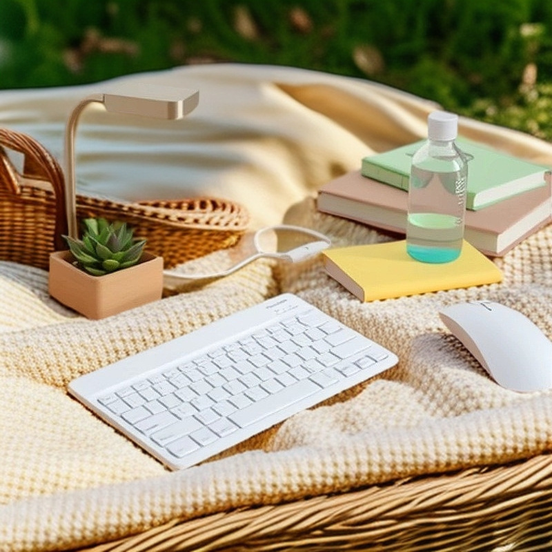 Keyboard dan mouse nirkabel Bluetooth dual-mode tipis yang cocok untuk ponsel dan tablet Apple, dapat diisi ulang, model berukuran kecil.