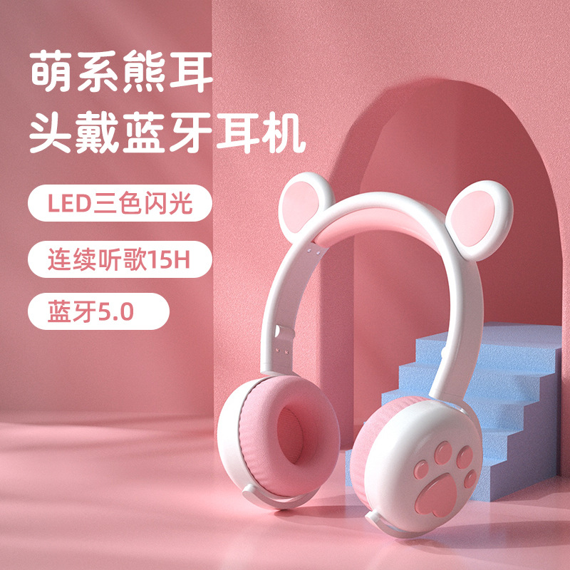 Qika headset telinga beruang imut lintas batas, headset Bluetooth cakar beruang LED tiga warna, lampu berkedip ajaib BK5