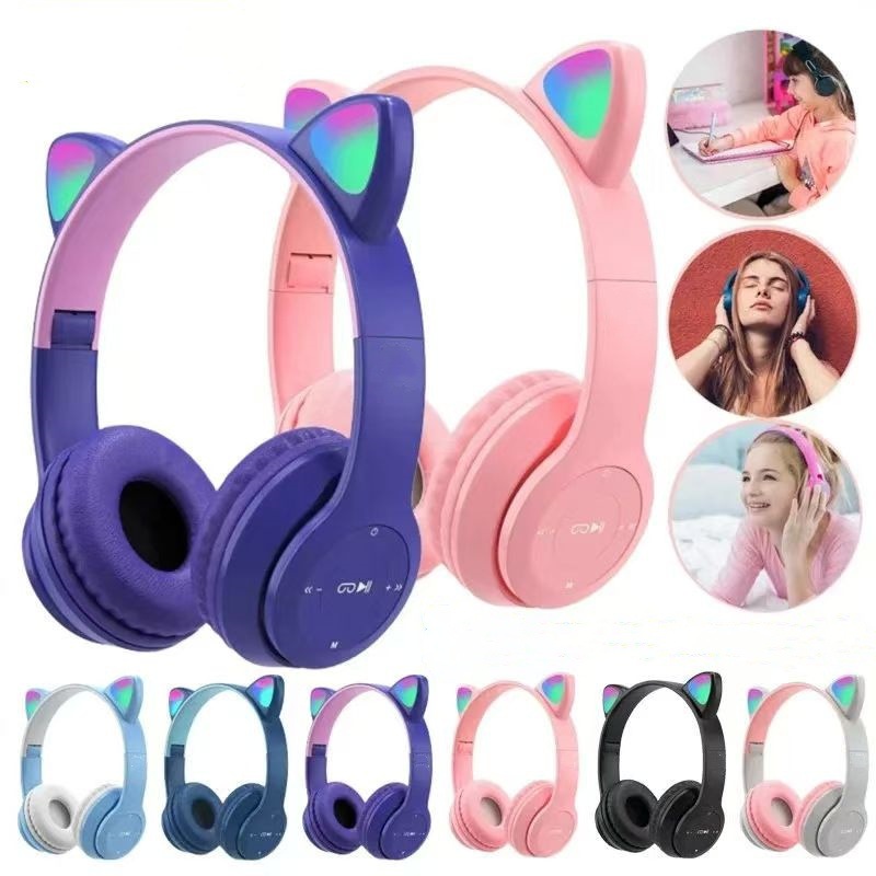 Kustom P47M Earphone Bluetooth Telinga Kucing Tipe Kepala P47M Earphone Nirkabel Telinga Kucing Bercahaya Bisa Plug Kartu