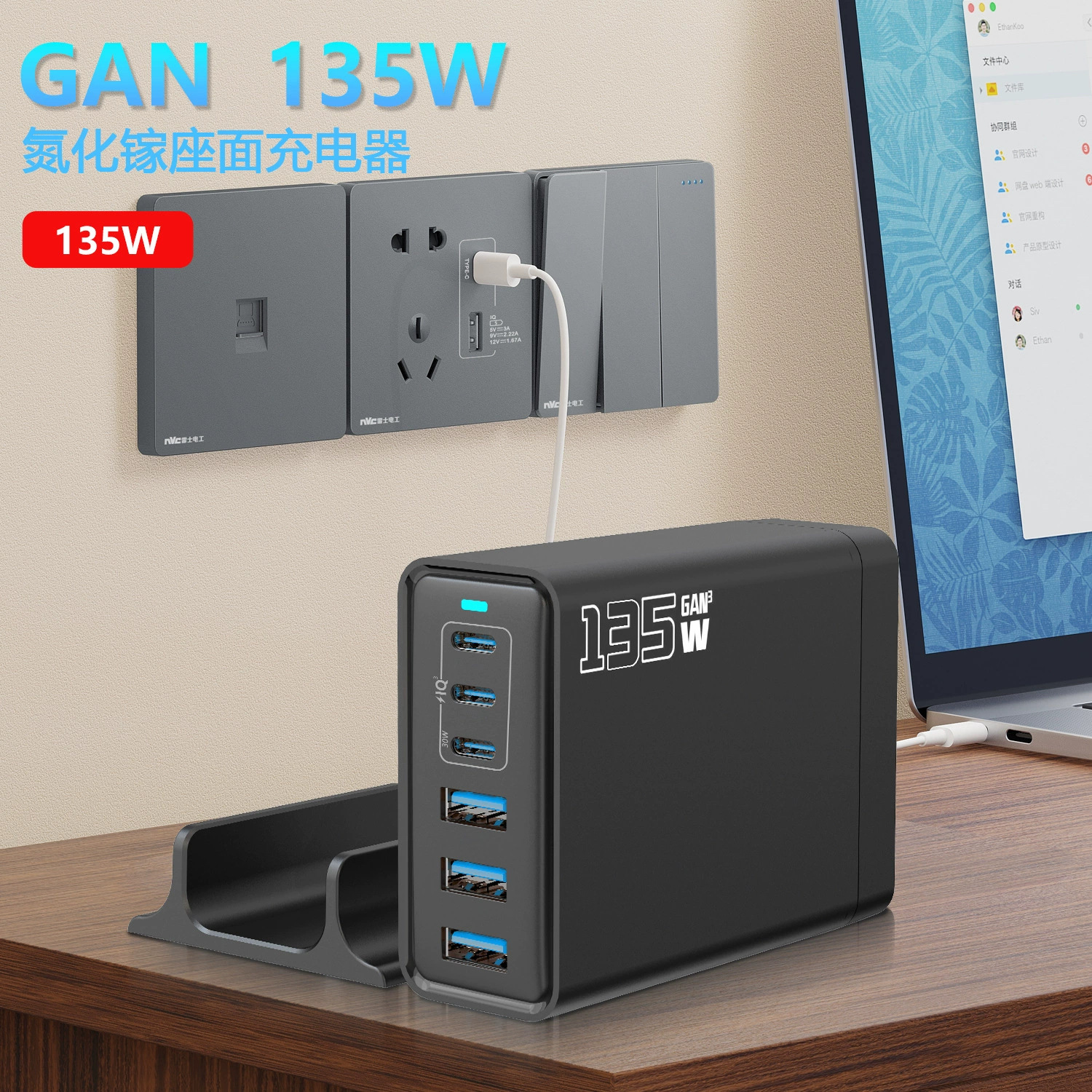 135W Pengisi Daya Notebook Gallium Nitride Adaptor Daya Dua Mulut Universal Super Cepat Multifungsi Cepat
