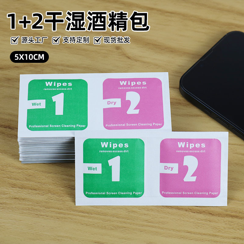 Pabrik grosir film telepon seluler tas alkohol film tempered pembersihan Inggris tas basah dan kering set tiga potong dapat tersedia