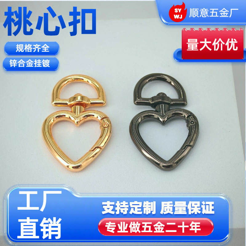 Paduan seng dengan D berputar persik hati gesper bagasi berbentuk hati liontin perangkat keras kait gesper pegas gantungan kunci aksesori bagasi