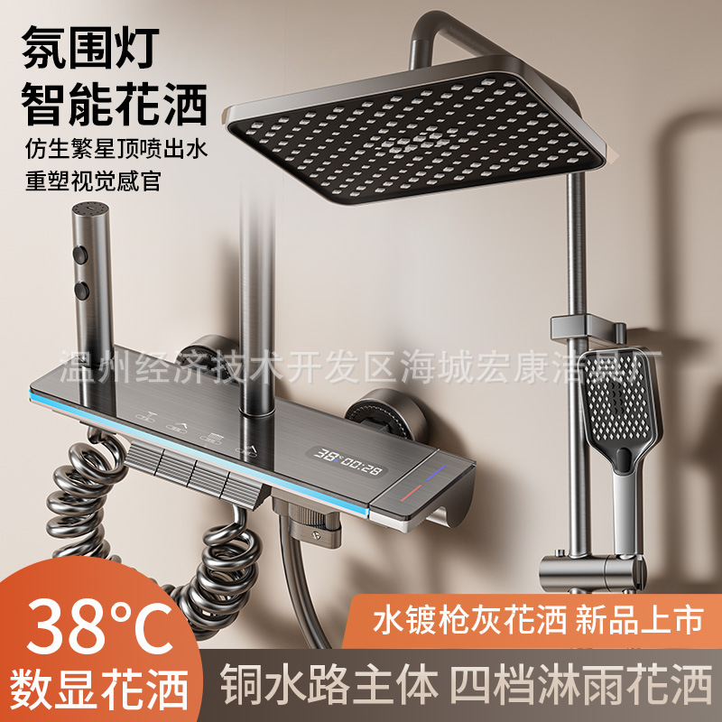 Set pancuran tampilan digital pintar tembaga baru yang modern, set pancuran kamar mandi rumah, penguat abu-abu pistol