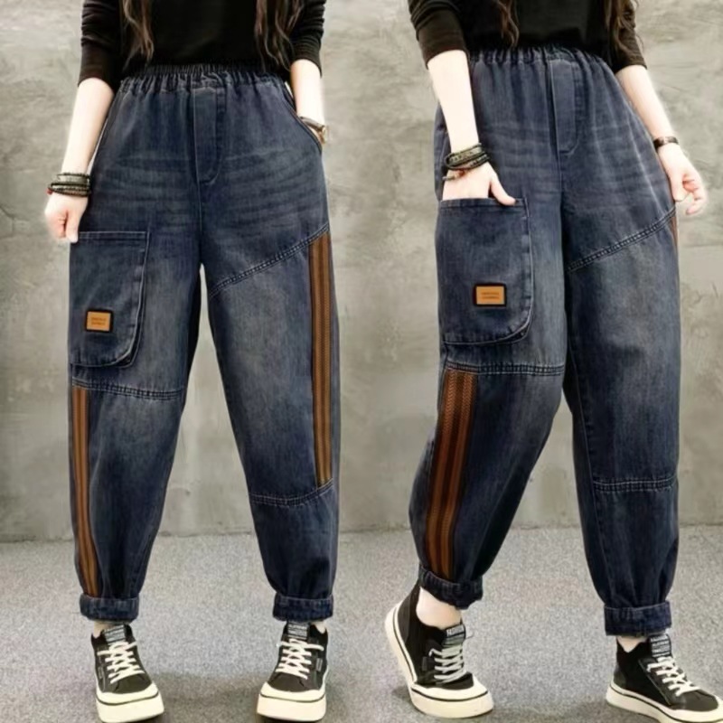 Celana harem Denim dicuci untuk wanita, celana kasual serbaguna pelangsing pinggang elastis longgar ukuran besar musim gugur 2023