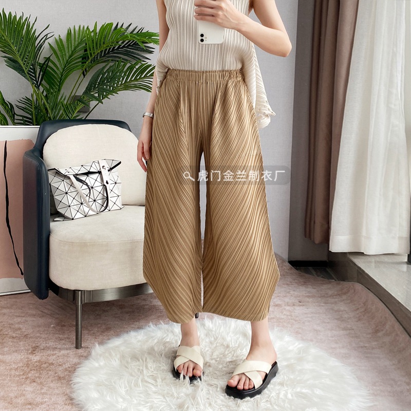 Sanzhai celana lipit wanita, celana lipit wanita musim panas pinggang tinggi, celana pelangsing kasual longgar ukuran besar, celana pisang kaki lebar tipis