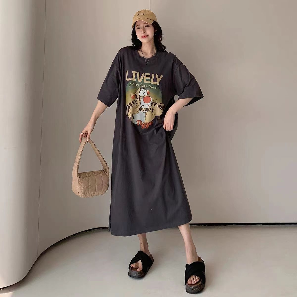 Gaun katun ekstra besar, Kaus katun longgar ukuran besar bercetak kartun lengan pendek gaya Korea rok kasual musim panas