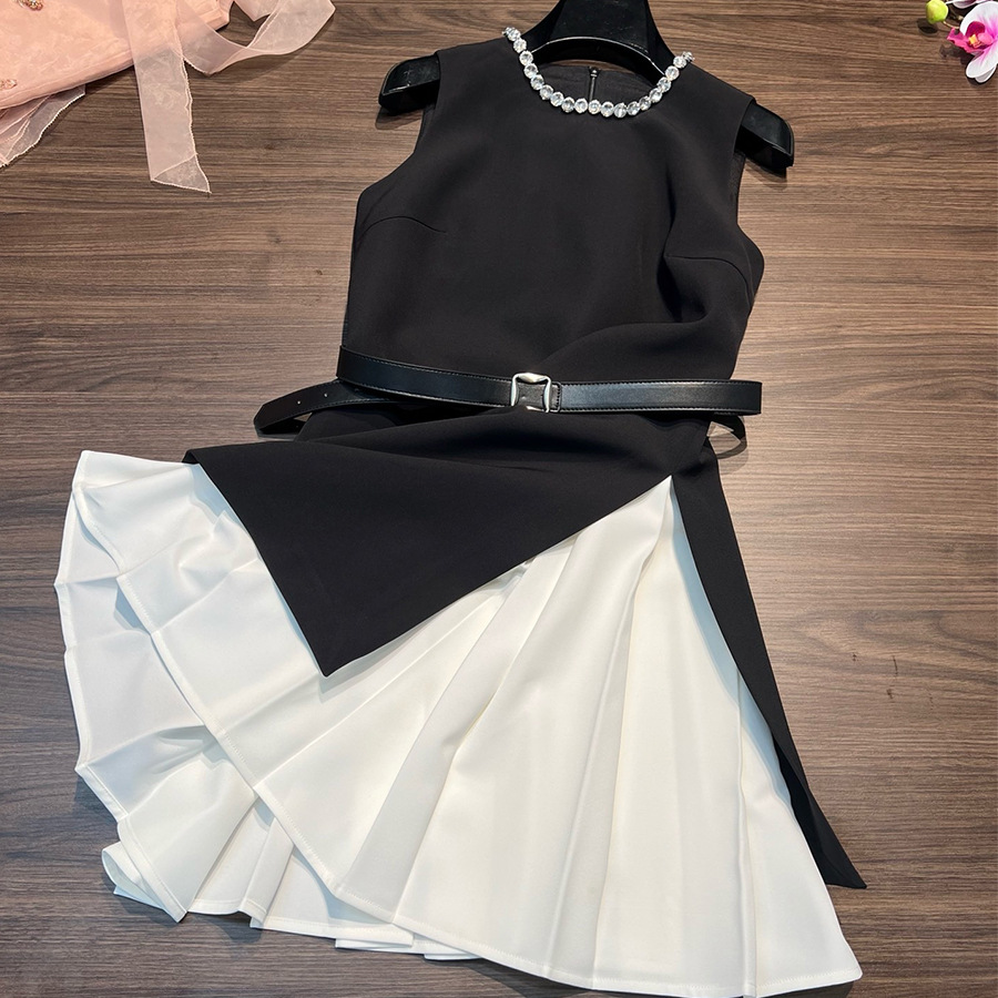 miu系高版本黑色无袖百褶拼接背心裙圆领镶钻显瘦名媛气质连衣裙