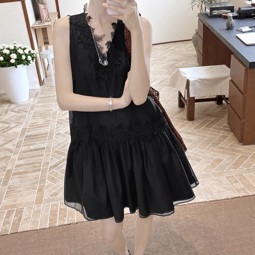 Gaun Elegan Modis Kasual Rok Hitam Kecil Panjang Sedang Musim Panas Wanita Rok Tanpa Lengan Longgar Terlihat Kurus Lipit