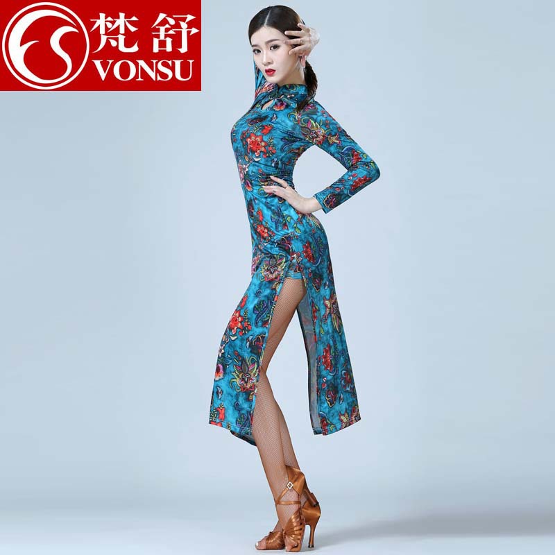 Fanshu pakaian dansa Latin wanita, baju cheongsam ditingkatkan musim gugur dan musim dingin, pakaian latihan performa, ukuran plus untuk wanita dewasa
