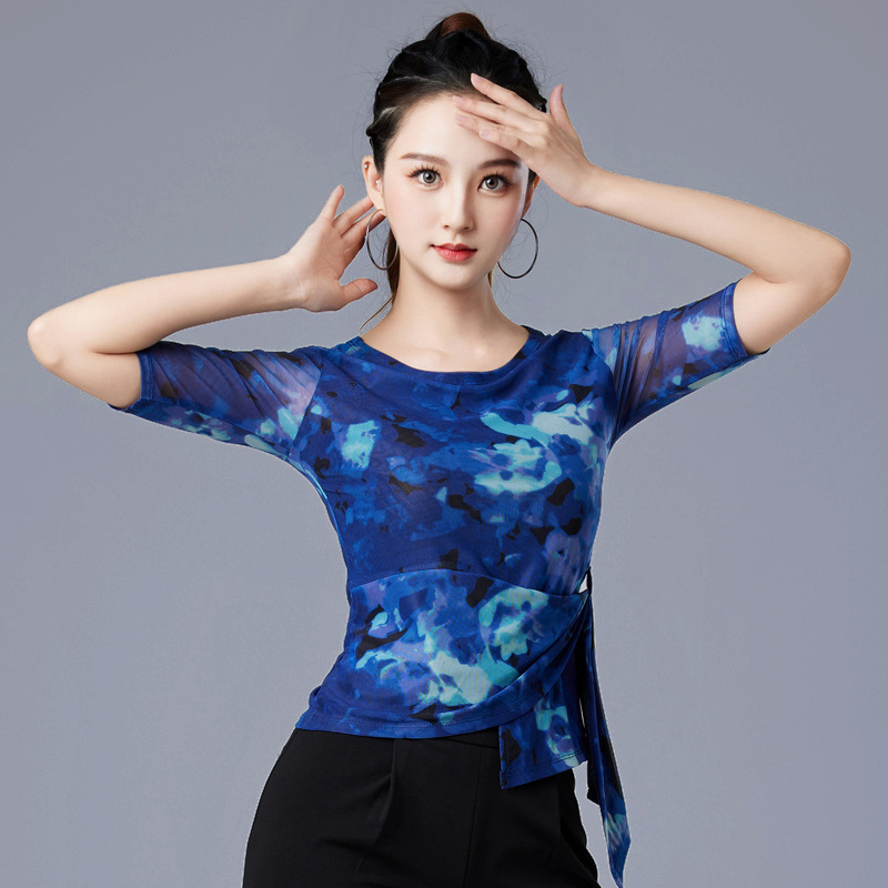 Baju dansa standar nasional wanita, pakaian atasan tari Latin lengan sedang jala