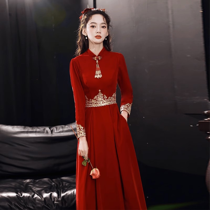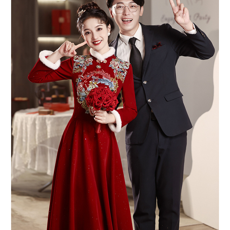 Gaun cheongsam gaya Cina baru untuk pengantin, pertunangan, pernikahan, gaun malam, merah 2025 gaun beludru lengan panjang baru.