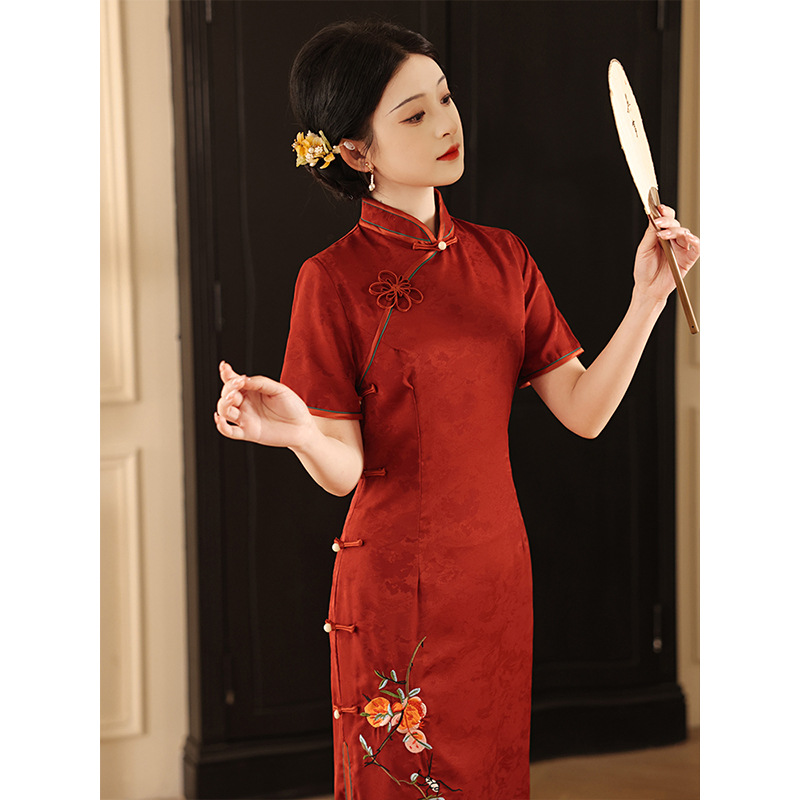 Gaun cheongsam baru yang ditingkatkan, bergaya retro elegan, warna merah, cocok untuk pesta pernikahan, gaya cheongsam muda