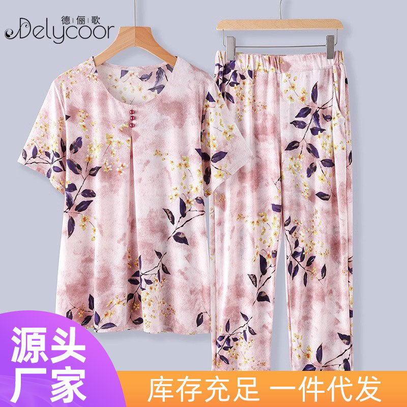Piyama lengan pendek untuk wanita paruh baya dan lansia, setelan pakaian rumah sutra es tipis keren untuk ibu baru musim panas 2024