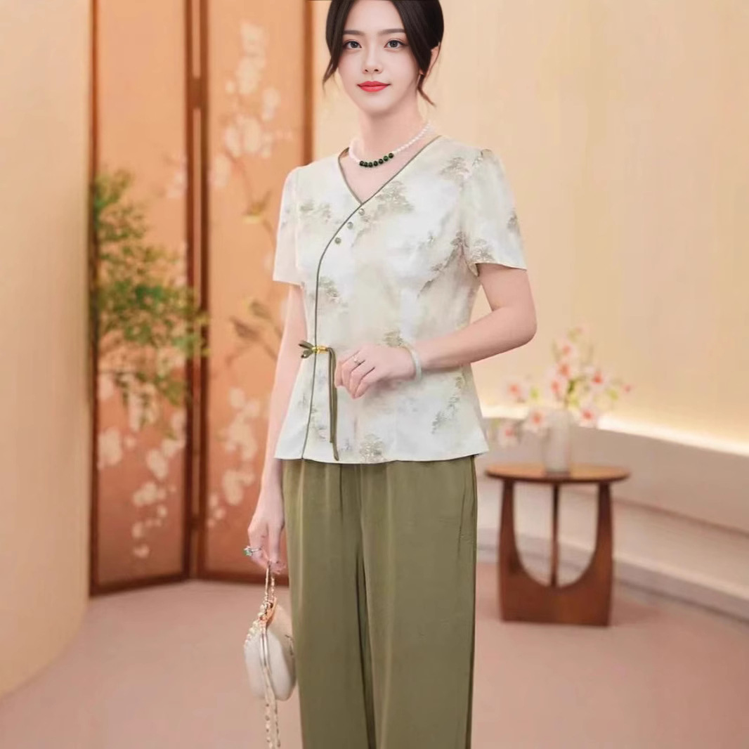 Pakaian Ibu Setengah Baya Gaya Barat Model Baru Musim Panas 2025 Celana Kaki Lebar Modis Set Dua Potong Lengan Pendek Gaya Tiongkok Baru Hari Ibu