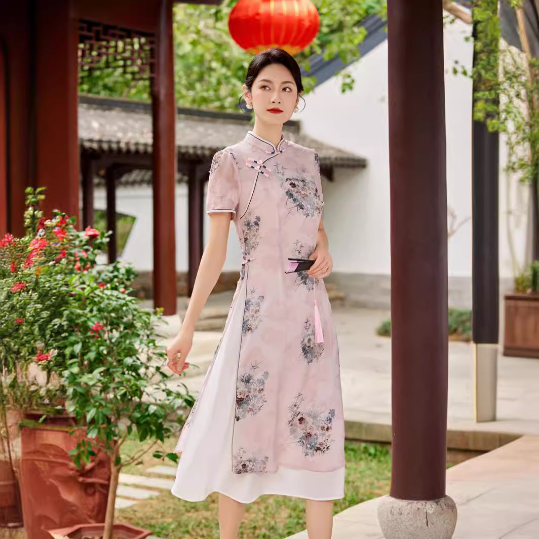 Gaun ibu paruh baya musim panas wanita, setelan baju Tang retro elegan muda ditingkatkan, ao dai cheongsam ukuran plus gaya Barat kelas atas