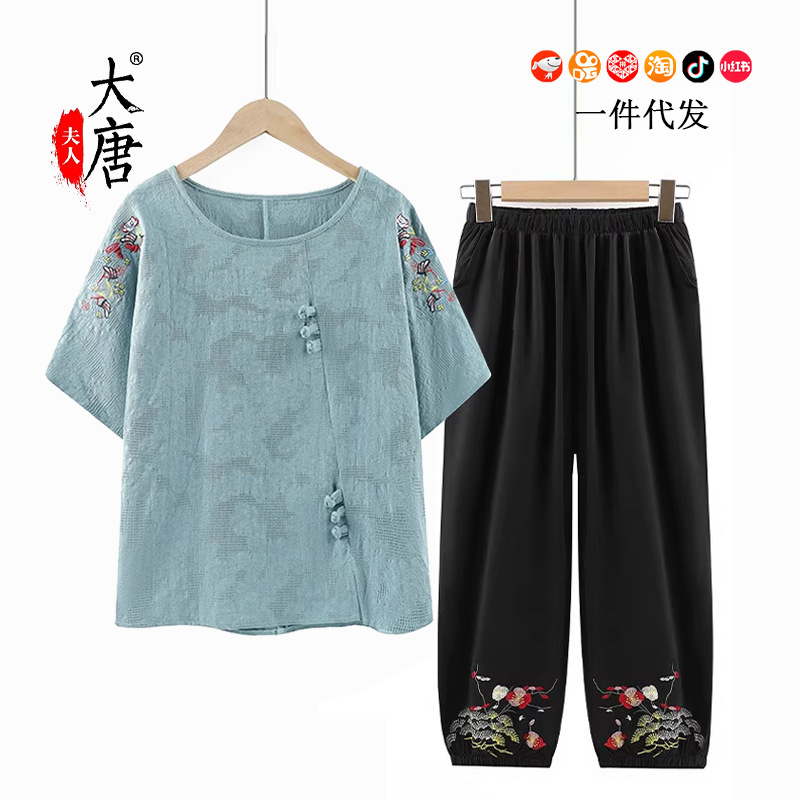 Setelan Modis Lengan Pendek Kasual Ibu Pakaian Musim Panas Elegan Mulia 40 Tahun Wanita Paruh Baya Set Dua Potong Model Baru Setengah Baya dan Tua