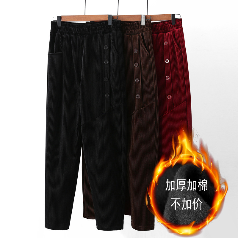 Celana wanita paruh baya dan lansia, pakaian luar katun wanita korduroi berjajar bulu tebal musim gugur dan musim dingin