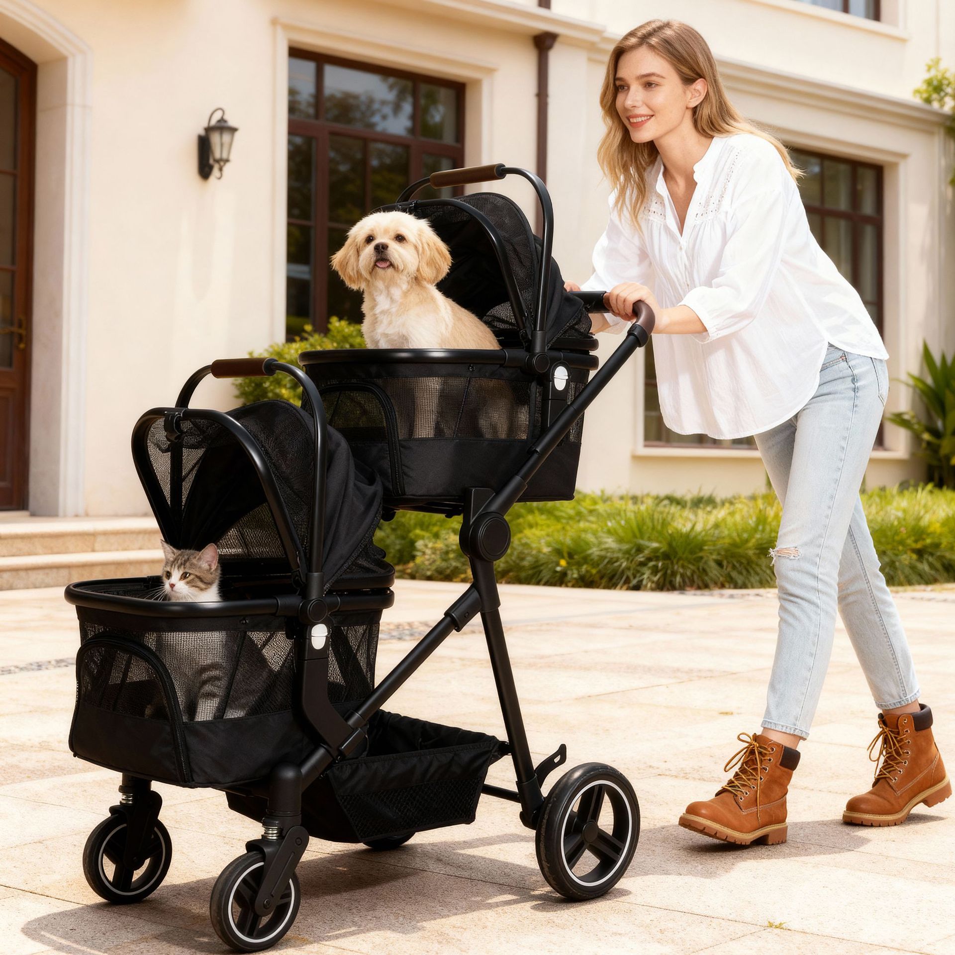 Kereta Dorong Hewan Peliharaan Bertingkat Atas dan Bawah Model Baru Lintas Batas Ruang Besar Universal Kucing dan Anjing Kereta Dorong Hewan Peliharaan Dapat Dilepas