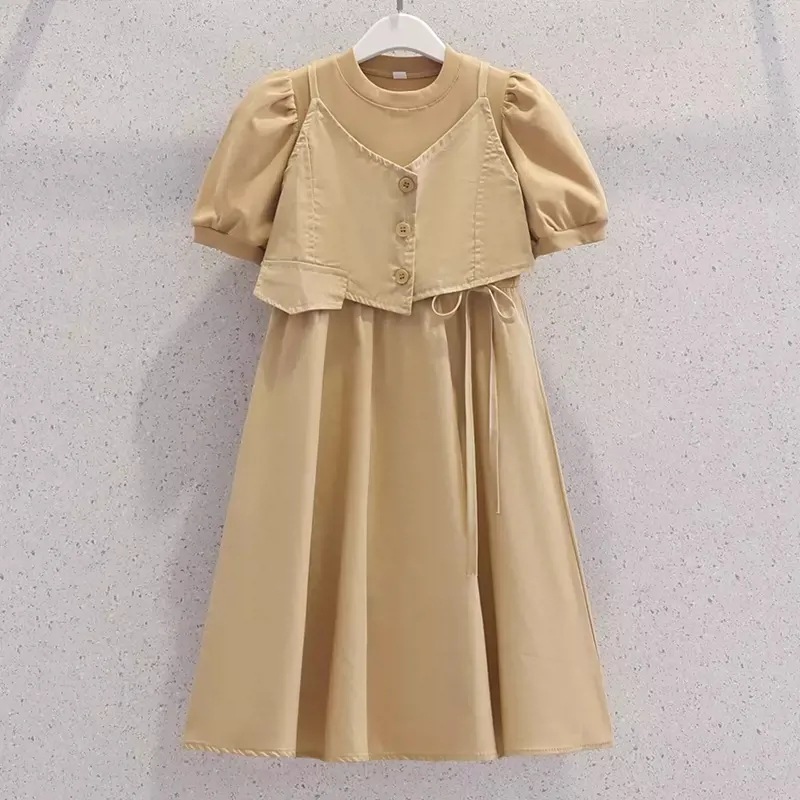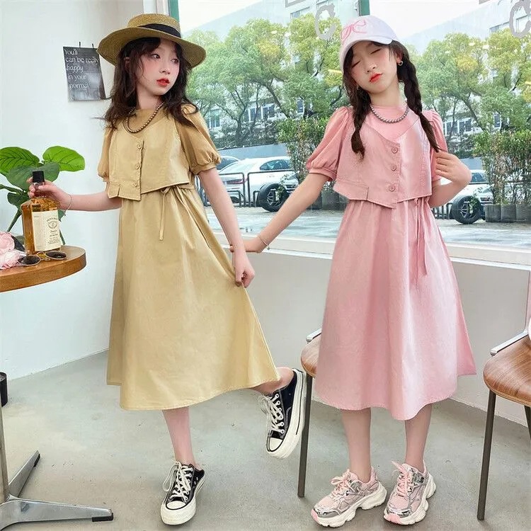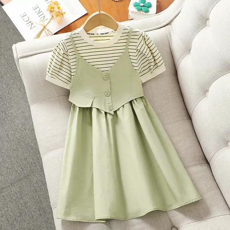 Gaun Anak Perempuan Pakaian Musim Panas Rok Putri Modis Gaya Barat Model Baru Rok Dua Potong Palsu Gadis Lengan Pendek Anak Sedang Besar Musim Panas