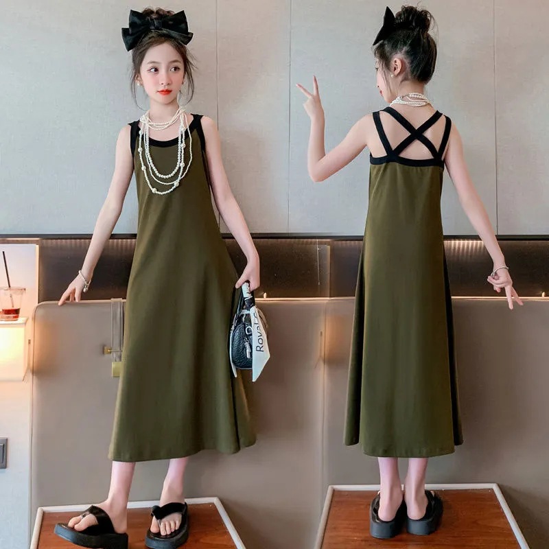 女童夏季无袖背心连衣裙新款儿童薄款韩版过膝修身小女孩露背长裙