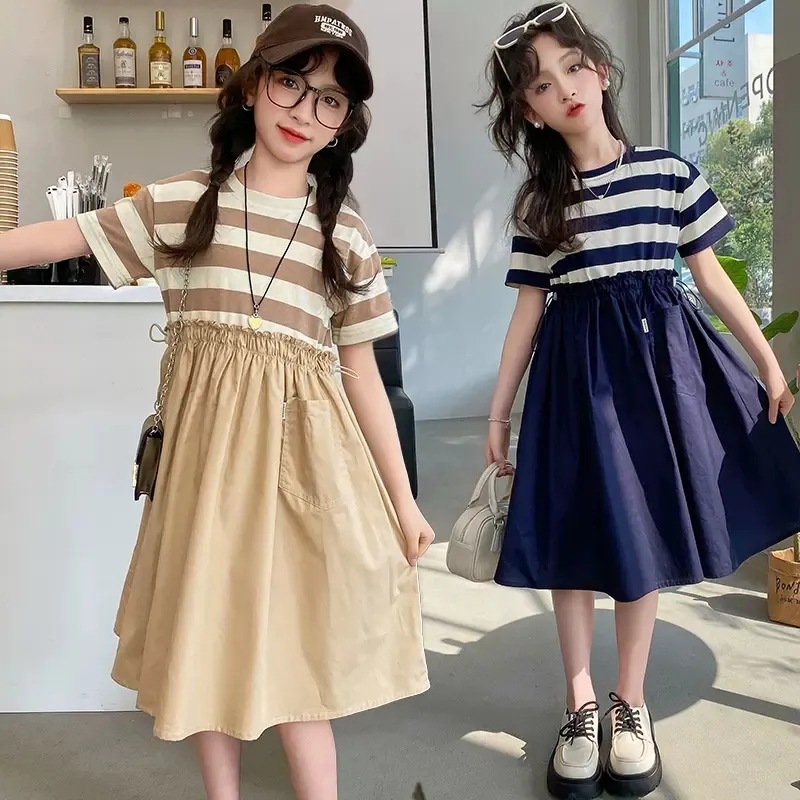 女童夏季连衣裙新款洋气儿童短袖拼接裙子女大童条纹假两件连衣裙
