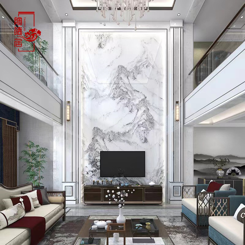 Lukisan pemandangan Cina lubang tinggi ruang tamu marmer plat batu suhu tinggi dinding latar belakang TV bangunan dupleks Villa tinggi mewah ringan