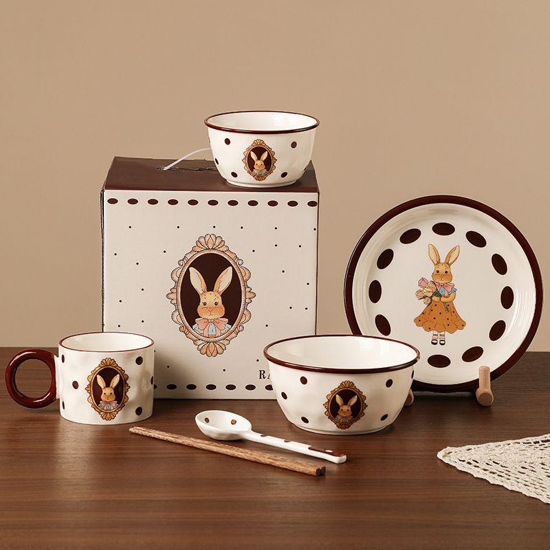 Ruiya mangkuk kelinci retro kreatif setelan satu orang makanan keramik peralatan makan membuka real estate set hadiah kotak hadiah mangkuk