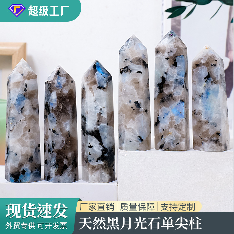Kristal Alam batu bulan heksagonal prisma hitam abu-abu batu bulan batu mentah dipoles tunggal kolom runcing kolom kristal labradorite grosir