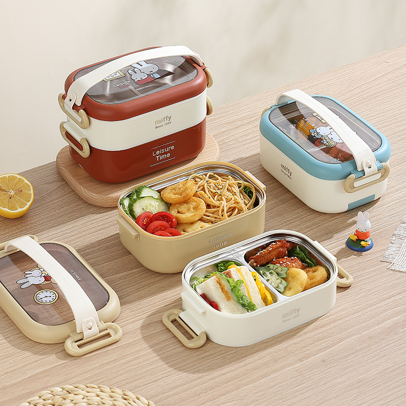 Kotak makan siang baja tahan karat dua lapis Miffy, kotak makan siang dewasa berinsulasi, kotak makan siang portabel untuk siswa sekolah dasar