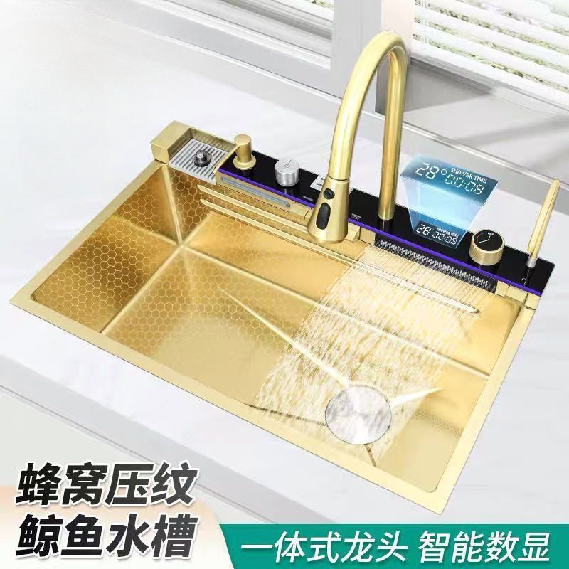 Emas Ikan Paus Tebal 304 Stainless Steel Wastafel Nano Honeycomb Piano Tampilan Digital Dapur Air Terjun Hujan Cuci Sayur