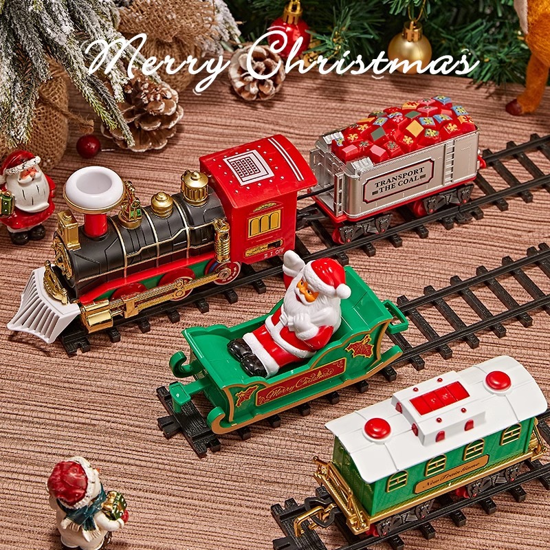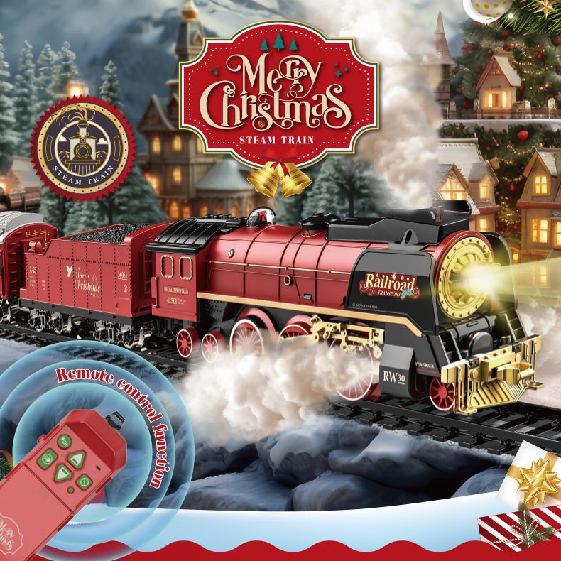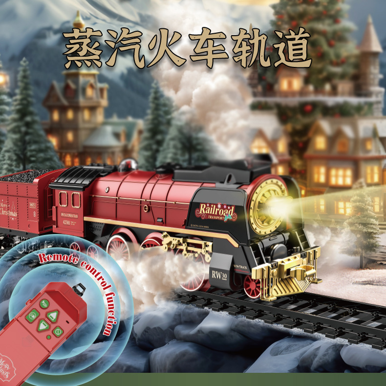 遥控复古蒸汽圣诞小火车玩具冒烟电动圣诞喷雾古典火车玩具带轨道