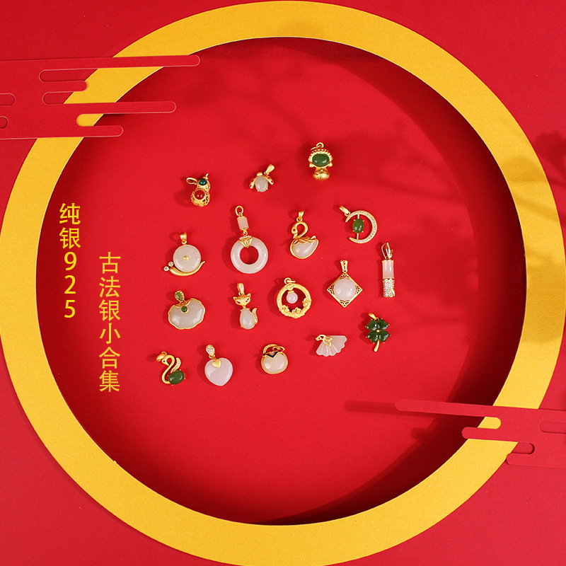 Perak kuno S925 perak bertatahkan liontin giok Hetian alami siaran langsung kelompok liontin giok putih panas hadiah pembelian grosir