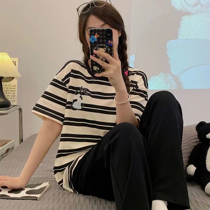 Celana Panjang Baju Tidur Lengan Pendek Anak Kucing Kartun Pakaian Rumah Manis Lucu Gaya Ins Dapat Dipakai Luar Longgar Kasual Musim Panas Wanita