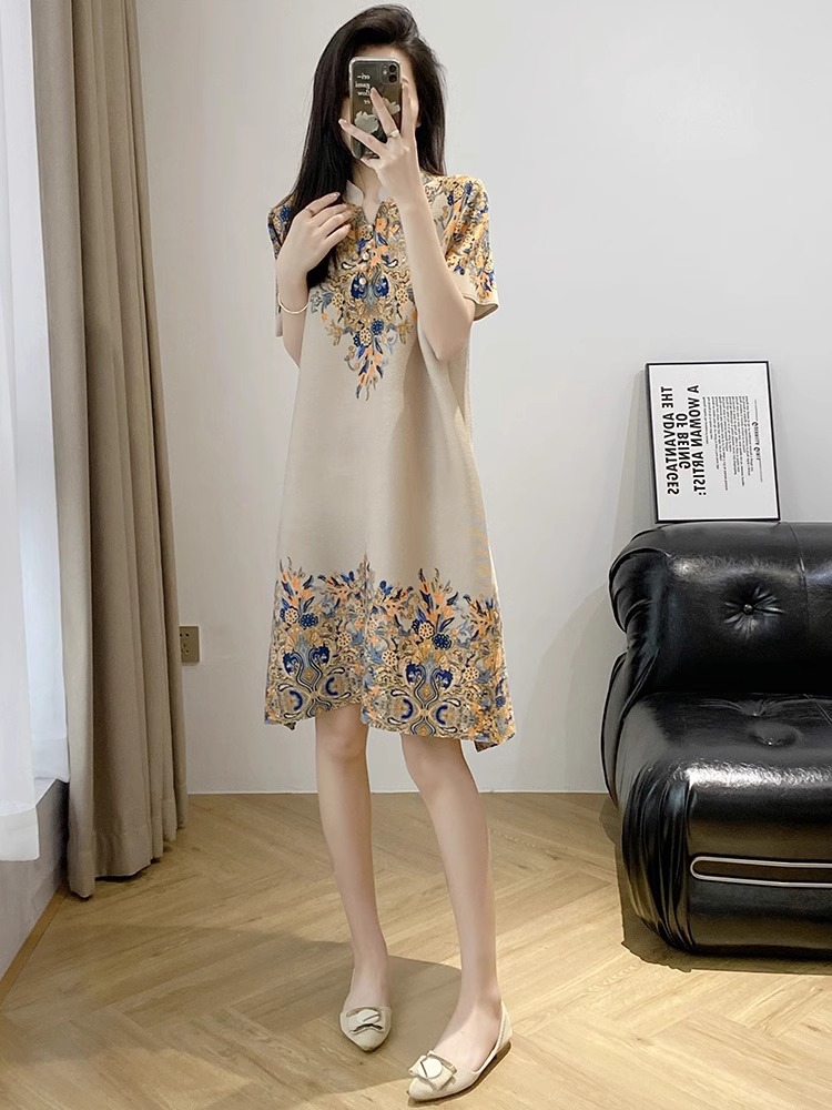 三宅风褶皱连衣裙2024印花大码女装胖mm孕妇装妈妈装国风国风印花